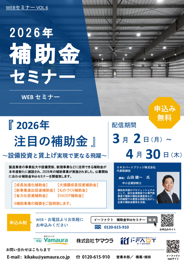 製造業者の事業拡大や新規事業、設備更新などに活用できる生産施設・設備の導入の補助金が継続され、2026年の様々な補助事業が実施されます。「2026年注目の補助金」について、Web セミナーを開催致します。