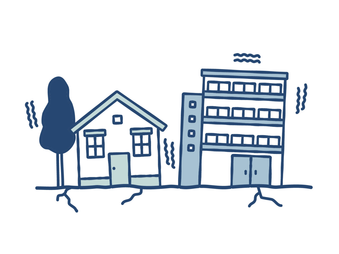 地震動による建築物の倒壊等の被害は、津波による浸水地域以外では死傷者発生の主要因です。近年の地震災害において、旧耐震基準(1981(昭和56)年以前)のものに倒壊等の被害が多くみられていることから、現行の基準への耐震改修及び建替えを検討する必要があります。